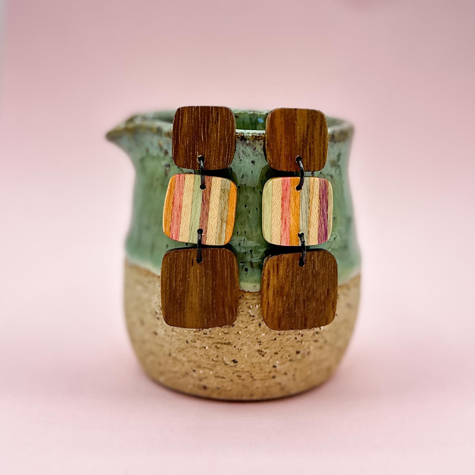 Introducing Sqaures Dangles, the perfect accessory for any outfit. Handmade from recovered spotted gum and dyed maple parquetry and finished with plant based oil, these earrings are not only beautiful but also eco-friendly. The surgical stainless steel fixings make them suitable for even the most sensitive ears.